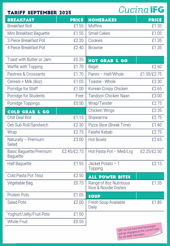 - A variety of healthy, tasty main meals prepared fresh every day from carefully selected ingredients. The menu will follow a similar weekly pattern, so you know what to expect, providing over 35 choices each day in addition to the ever-popular chef specials, themed events and loyalty schemes.